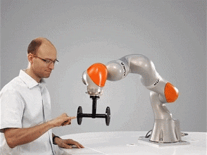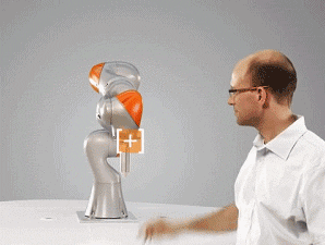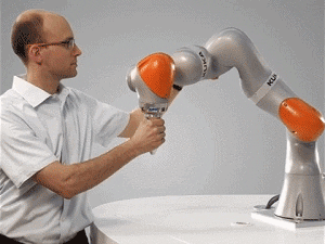 注意,操作人员仅使用小拇指 轻轻地触碰 便可以领 iiwa 跟随 ▼