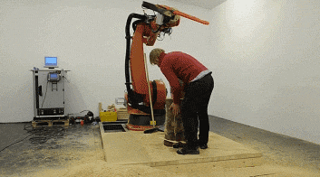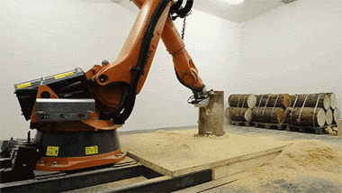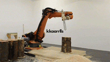 KUKA 机器人正在演示锯木头桩子 当然,这不是简单地锯木头